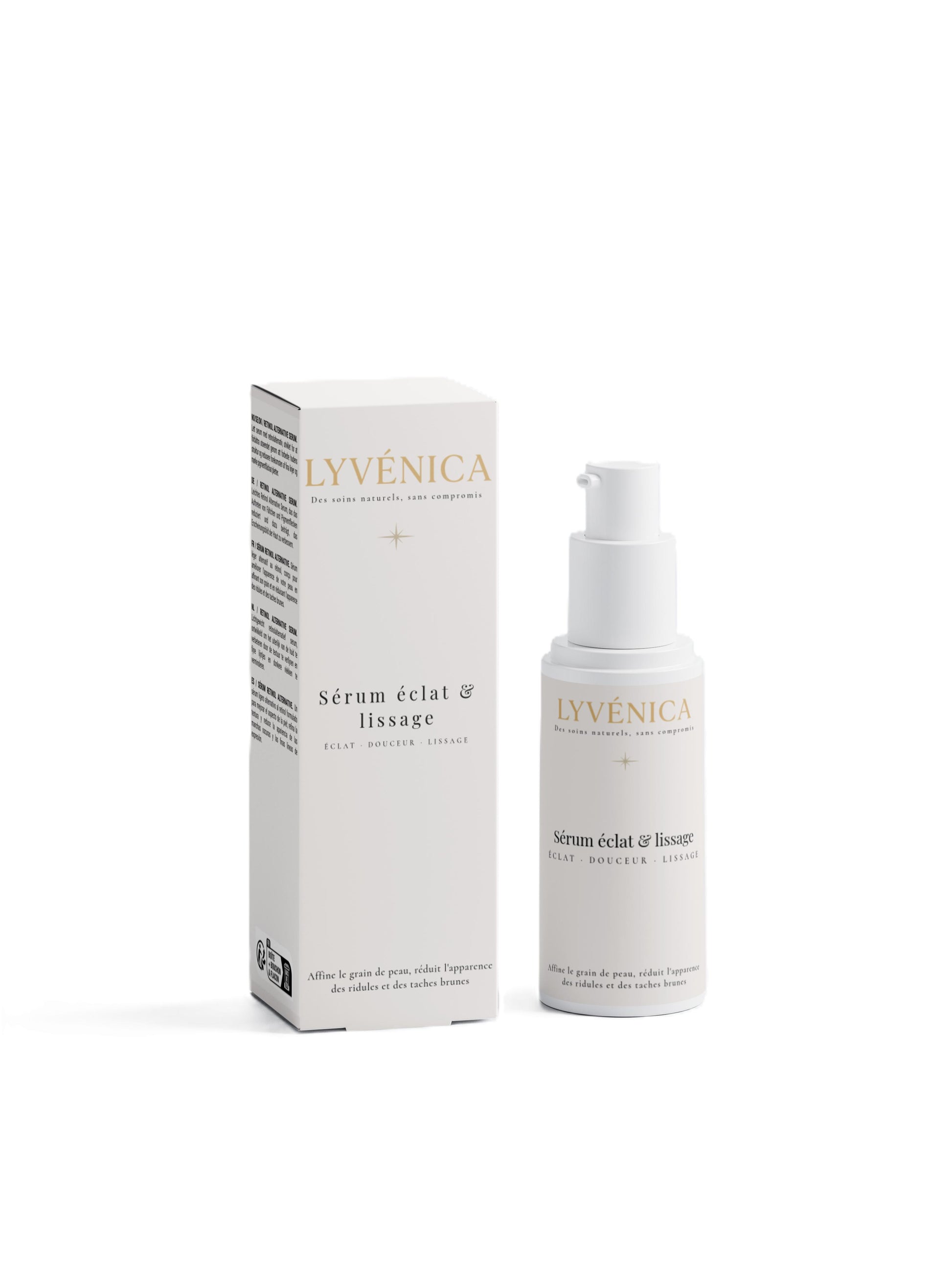 Véritable concentré d’éclat et de jeunesse, le Sérum Éclat & Lissage Lyvénica offre les bienfaits d’un soin anti-âge performant sans les effets irritants du rétinol.Sa formule végétale, enrichie en Bidens Pilosa (alternative naturelle au rétinol), Aloe Vera, Vitamine C et Myrte rose, lisse la peau, atténue les ridules et ravive l’éclat du teint.Grâce à sa texture légère et fondante, il pénètre instantanément pour révéler une peau plus douce, uniforme et visiblement plus lumineuse.